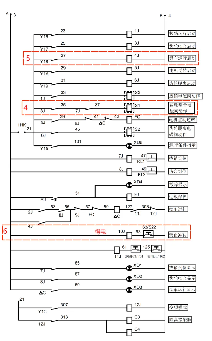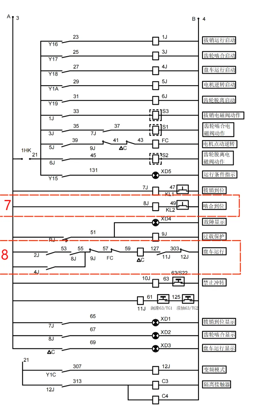 盘车在正常运行时,4J、11J、12J带电,9J不带电。盘车无法投用时,检查顶轴油压、润滑油压是否正常、拔销到位开关 KL1是否闭合、盘车齿轮啮合开关KL2是否 闭合。