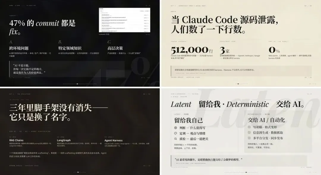 覆盖全场景演示需求:包含开场封面、章节幕封、数据大字报、左文右图、图片网格、Pipeline流程、悬念问题、大引用、Before/After对比、图文混排,无需手动调整版式,提示词即可匹配对应布局。