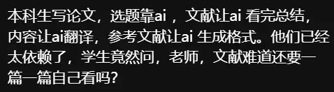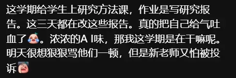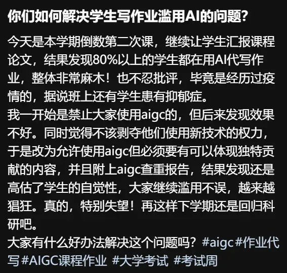 学生在学业中滥用AI不只是国外老师的问题,中国的老师也正被这个现象折磨的不轻。有老师在网上求助“如何解决学生写作业滥用AI的问题”,一开始禁止使用、发现管不住后就放低要求希望能在使用中有自己的原创性,结果还是不行,学生们照样用的猖狂。