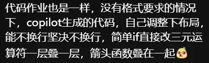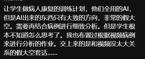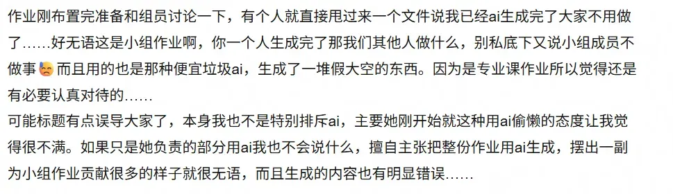 可有了AI后,小组成员不再有相互交流、沟通、评价、修改和共同思考的过程,只需要花费一点时间把自己的任务丢给AI完成,再丢给小组负责人即可。从完成过程到完成的质量,都是一言难尽。