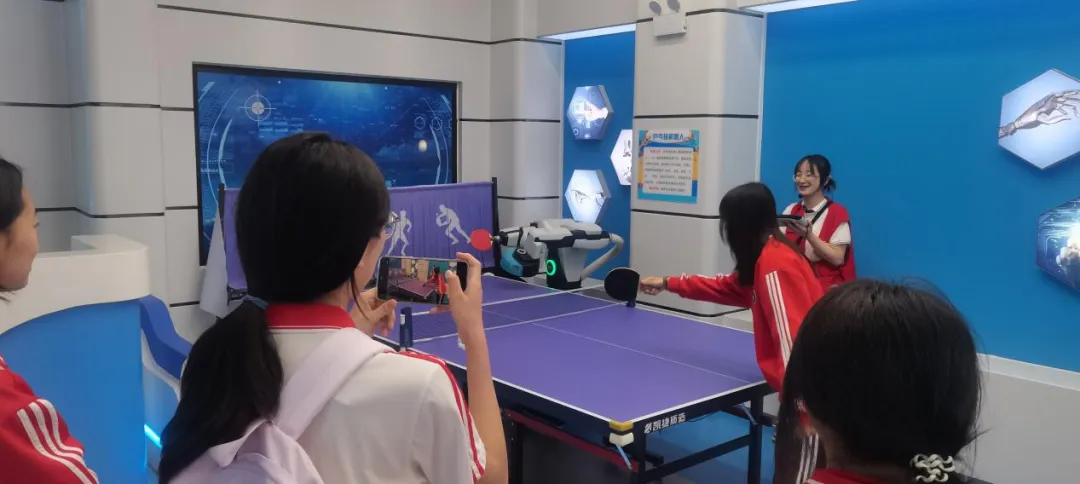 活动现场,“科普大篷车”率先拉开本次研学的序幕,新奇的科普展品让同学们驻足围观、好奇探索。进入科技馆展厅后,各类智能科技展品瞬间吸引了全体师生的目光。酷炫的机器人乐队整齐列队,用灵动精准的动作完成乐器演奏,献上了别开生面的科技演出;灵活敏捷的四足机器人完成行走、转身、避让等一系列高难度动作,引得同学们阵阵惊呼;憨态可掬的优优机器人主动和同学们互动问答、趣味交流,让大家直观感受到人工智能的趣味性;最热闹的乒乓球互动展区里,乒乓球机器人化身“特殊球友”,和同学们同台对打、你来我往,大家一边上手体验,一边记录精彩瞬间。