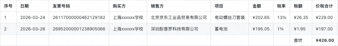 /tmp/invoices_archive/├──202603/│ ├──20260324_19700_上海xxxxxx_8905066.pdf│ ├──20260324_21400_上海xxxxxx_1129182.pdf│ └──...