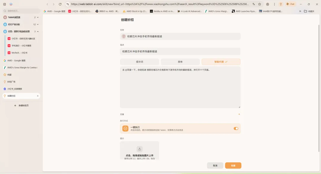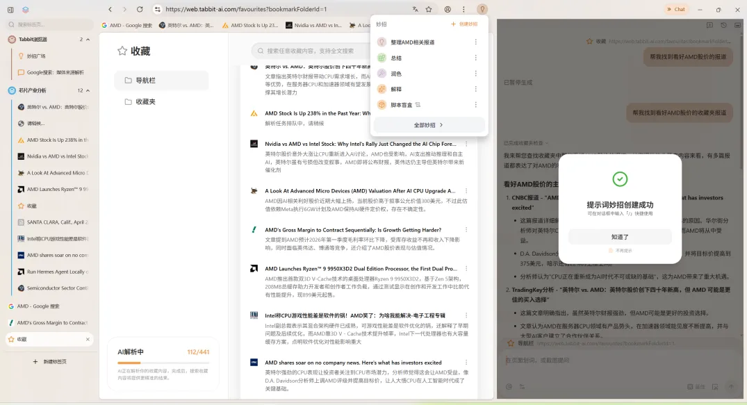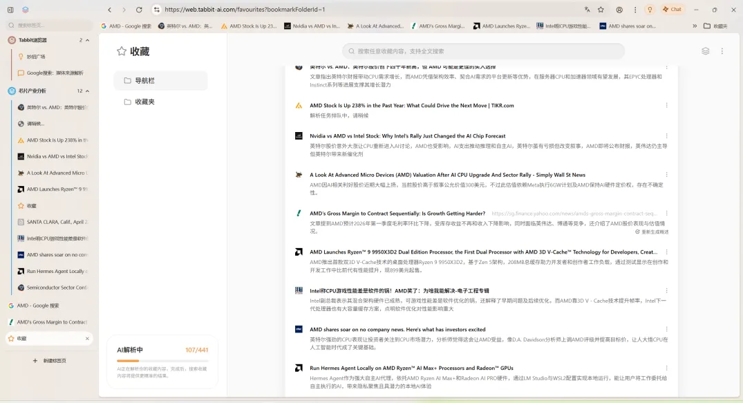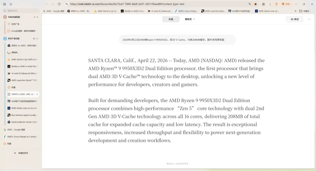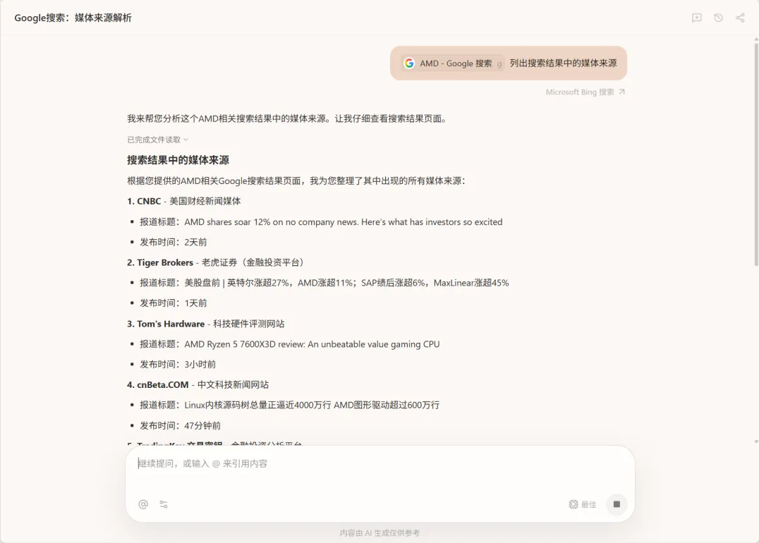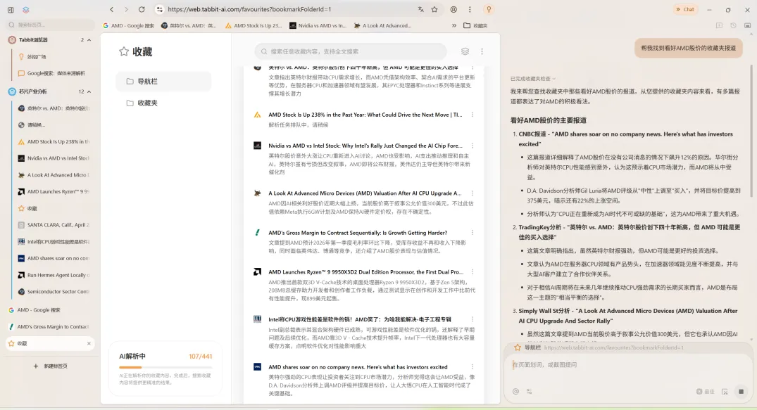 更重要的是,Tabbit支持直接与AI对话,总结梳理整个标签组的相关内容。如针对“芯片产业分析”这组标签组,对话AI要求分析媒体判断,立即就能获得“该组媒体对AMD前景一致乐观”的结果,并附带详细分析。