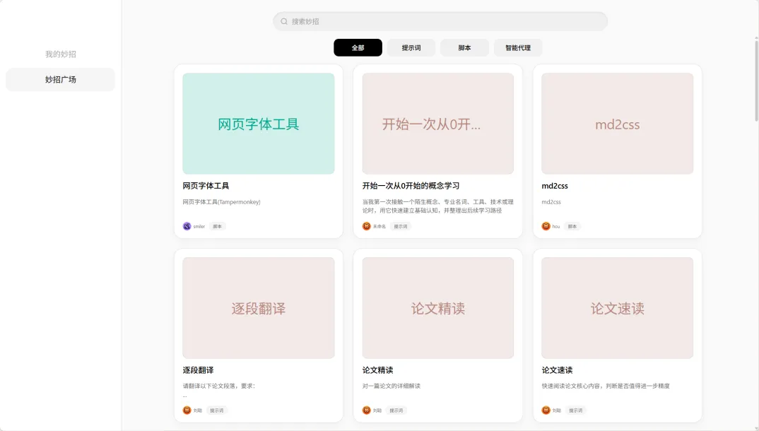 妙招功能则支持用户将常用的AI提示词、AI指令保存为快捷指令,需要用时在对话中输入“/”就能立即唤起,无需重复输入,避免遗忘。平台的妙招广场则有全网用户生成的常用妙招,供你随时“抄袭”,简化工作。