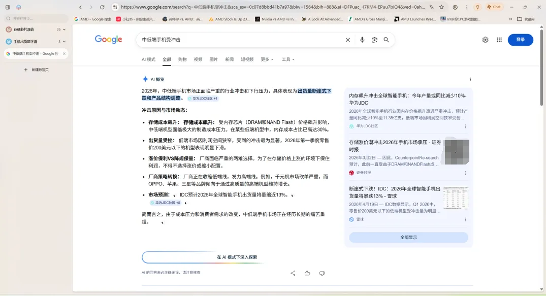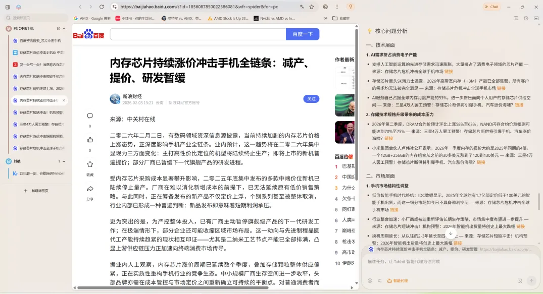 可以看到,Tabbit已经根据存储芯片涨价、手机出货量下滑的两个方向,将数十个网页整理为不同标签。