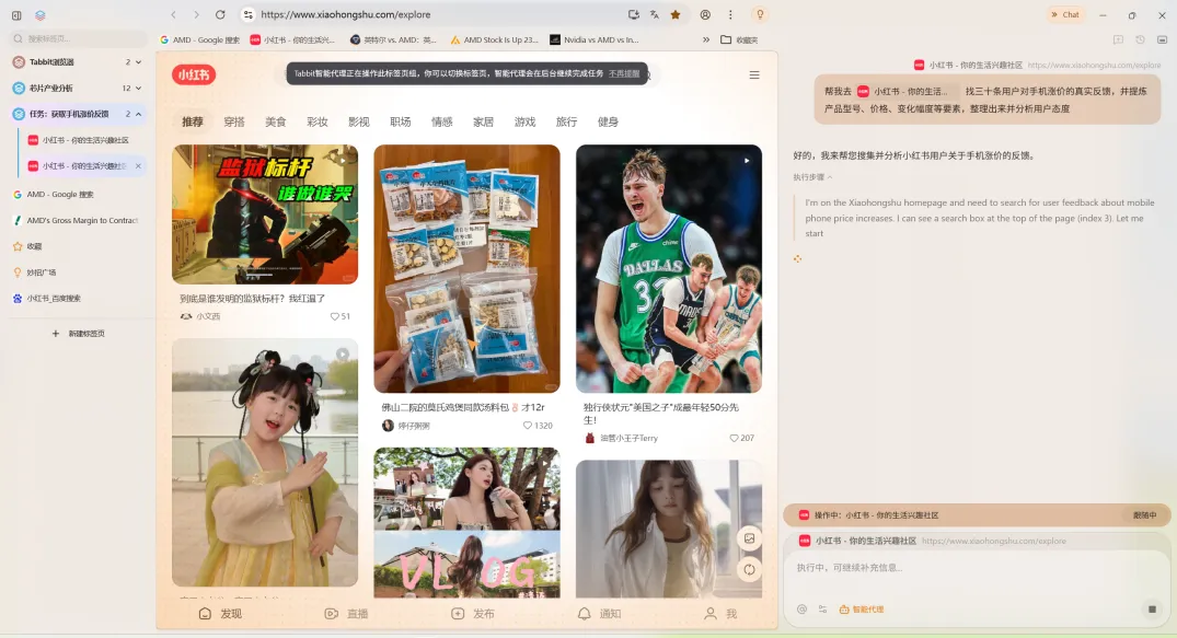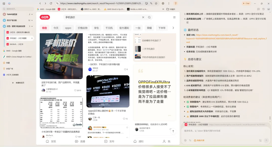 如果希望了解用户侧对手机涨价的反馈,就可以打开对话栏的智能代理功能,让Tabbit去社交媒体上帮忙找一找,现在的消费者如何看待手机涨价这件事。