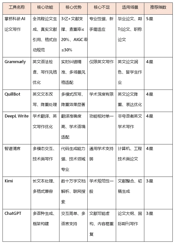根据实际需求匹配工具是关键。需要强文献支撑的深度学术写作首选掌桥科研AI论文写作,其AI论文生成能力基于真实文献库,学术可信度最高。纯英文论文优化可搭配Grammarly和QuillBot使用,技术类论文可考虑智谱清言。