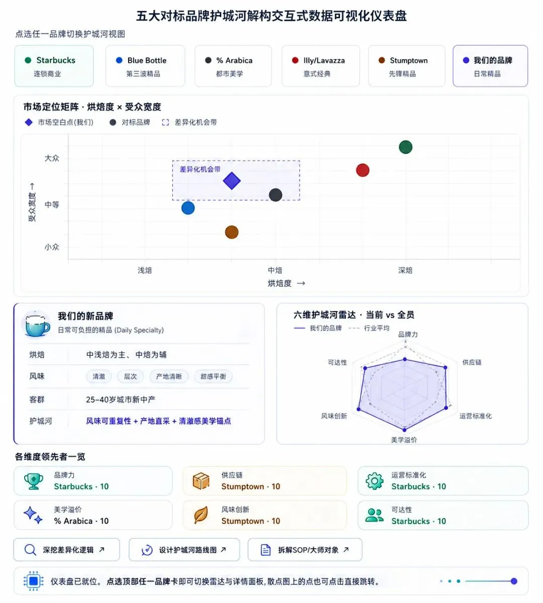 提示:帮我做一个五大对标品牌护城河解构交互式数据可视化仪表盘