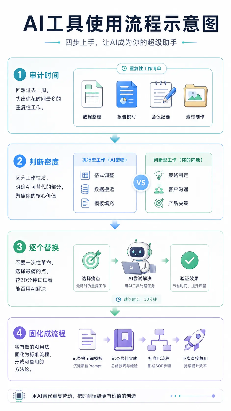 第三步:逐个替换。 不要试图一次性革命。选一个最痛的点,花30分钟试试看能不能用AI解决。