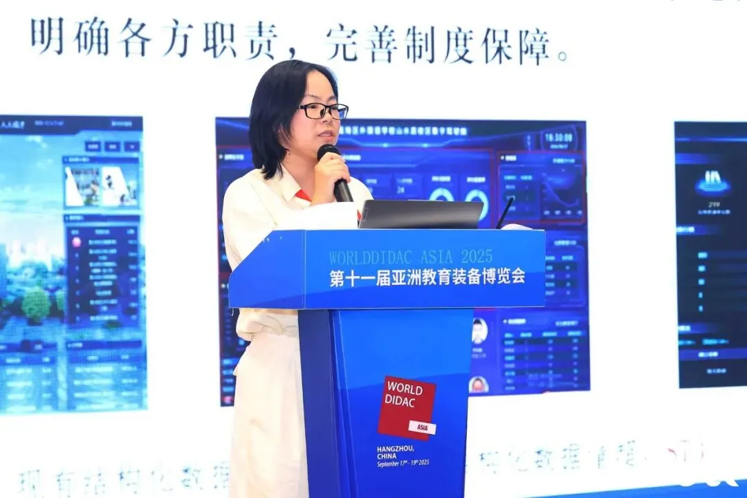 瓯海区教育技术中心副主任黄菊敏则从瓯海区域实践角度,分享人工智能如何赋能区域智慧教育生态重构。她以双向适配为主题,从“基座与赋能”“应用与场景”“治理与跃升”三个层面介绍了瓯海区构建“瓯教云”智能平台与高质量数据体系、推进人工智能与教育教学深度融合、打造数智驱动的区域教育智治生态的探索,呈现了区域整体推进智慧教育建设的“温州样本”。