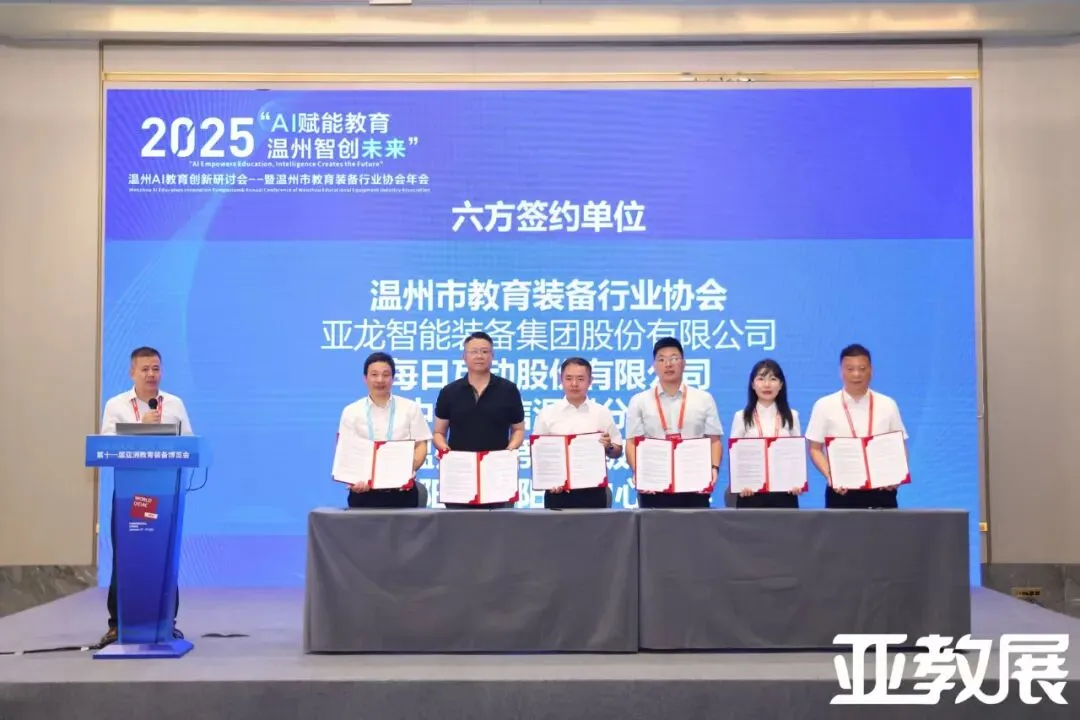 会议期间,通过“政-产-学-研-用”各方的深度对话,我们凝聚了“共创共赢”的广泛共识,成功促成温州市教育装备行业协会、亚龙智能装备集团股份有限公司、中国电信股份有限公司温州分公司、每日互动股份有限公司、温州市第八高级中学及平阳县昆阳第二小学共同签署六方《2025温州AI教育创新战略合作协议》。
