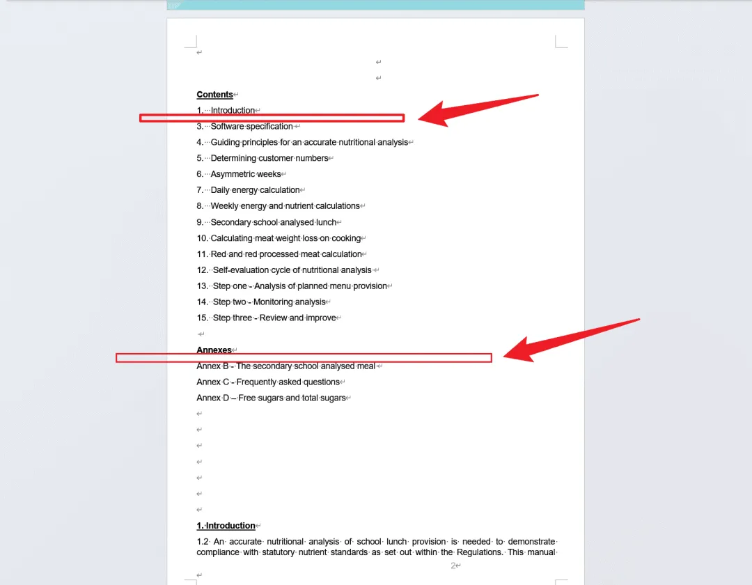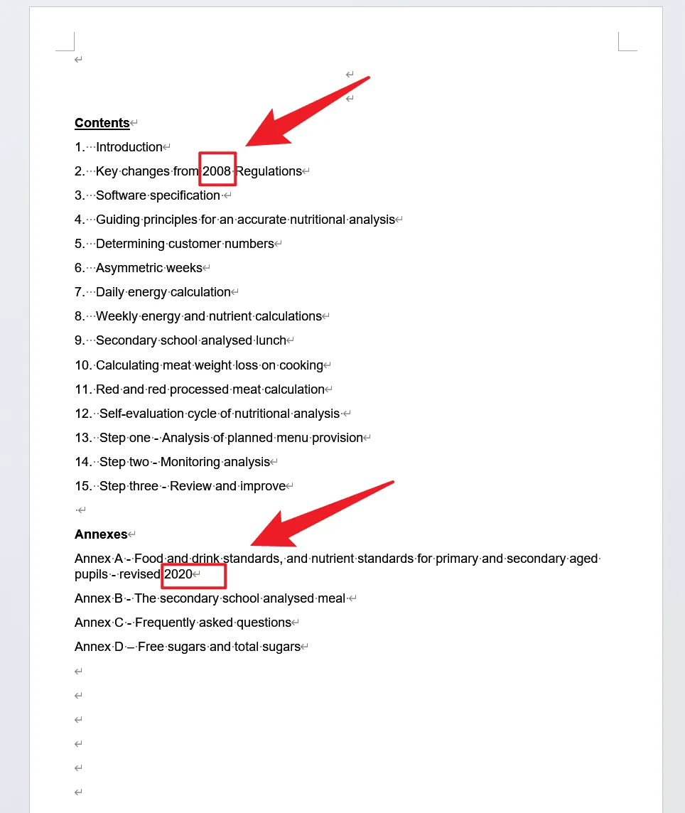 截图中可以看到,Word 文档的目录和附件部分有若干行内容包含特定年份,例如某一行包含“2008”,另一行包含“2020”。这些内容分别位于独立段落中。