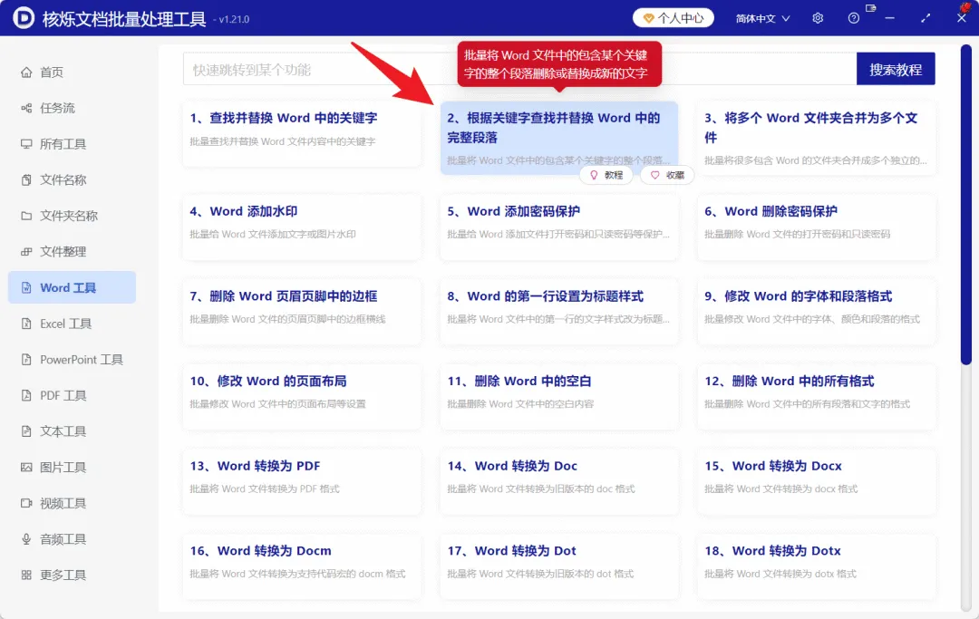 打开核烁文档批量处理工具后,在左侧选择“Word 工具”。在功能列表中,找到并点击“根据关键字查找并替换 Word 中的完整段落”。