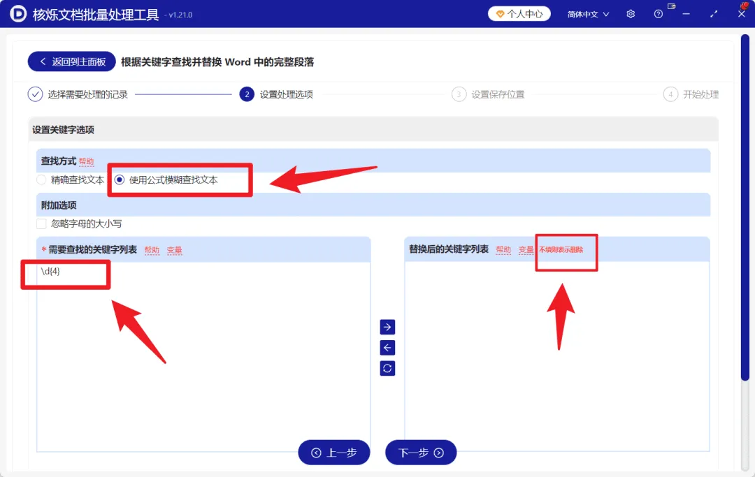 进入第2步“设置处理选项”后,先配置查找方式。截图中选中的是“使用公式模糊查找文本”,而不是“精确查找文本”。
