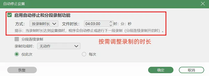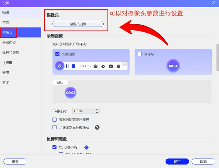 步骤2:选择要录制的窗口,根据个人需求调整录制区域、音频输入源以及是否启用摄像头等设置。如需自动结束录制,可启用“按时长录制”选项并设定时间,设置完成后,点击红色的录制按钮即可开始录制。