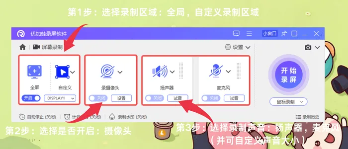 想找好用的电脑录屏软件?优加蛙录屏大师是个不错的选择。它是一款功能全面的电脑录屏工具,界面简洁直观,核心功能都清晰排列在主界面,无需复杂操作就能轻松上手。在录制模式方面,它支持屏幕录制、区域录制、窗口录制、摄像头录制等多种场景,不管是录制网课课件、游戏操作、线上会议,还是制作自媒体教程,都能精准满足需求。