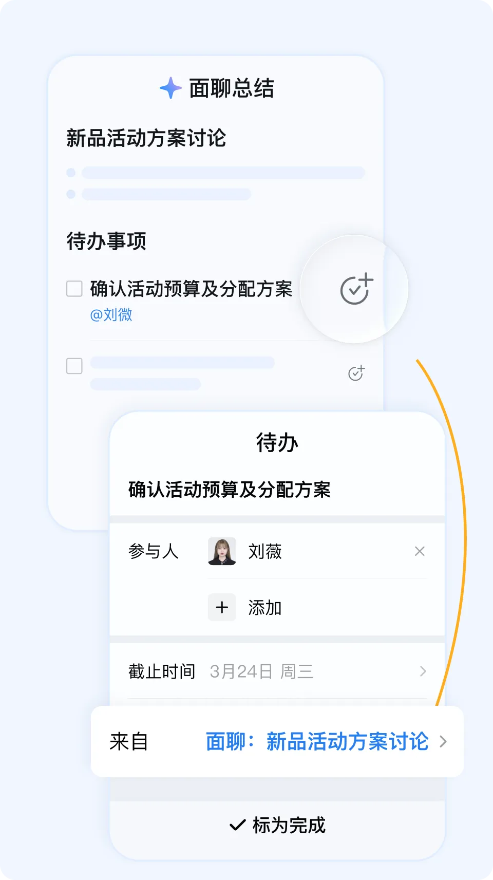 会后,「记录面聊」会自动生成面聊总结。AI 不仅能准确总结讨论内容,还会自动提炼待办事项,并对应到具体负责人。总结会自动同步给所有参会人,方便大家随时回顾,高效推进后续工作。(该功能目前处于灰度测试中)