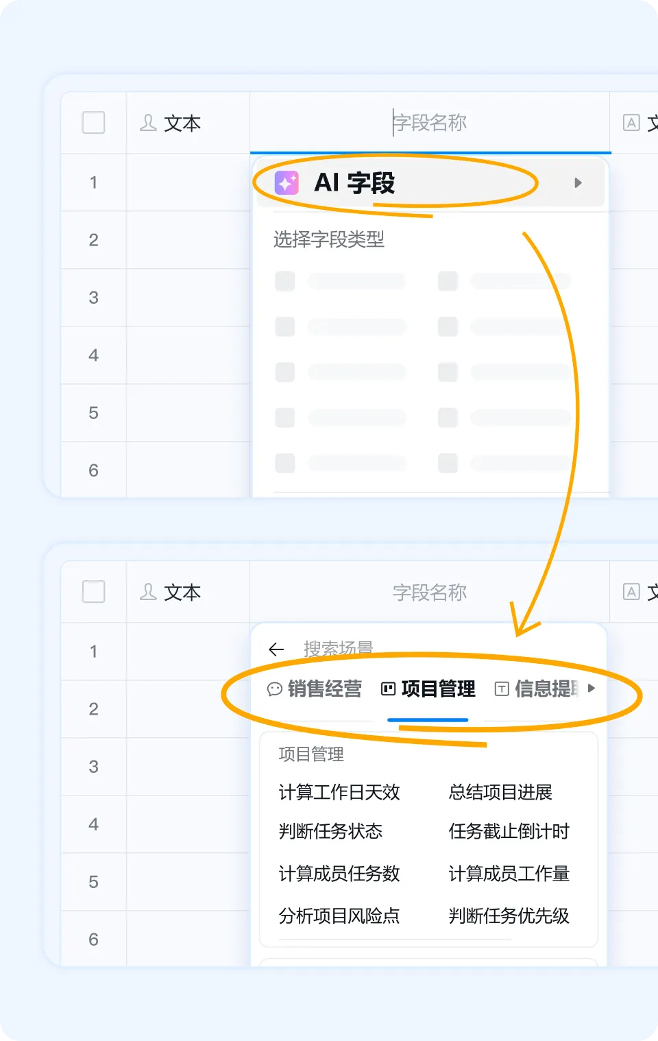 现在,我们针对最高频的业务场景,设计了开箱即用的“AI技能卡”——AI字段。你不需要懂技术、会写提示词,只需要选中你想实现的效果,就可以实现信息提取、客户打标签、业绩统计、文案生成等上百种操作,让 AI 在表格里真正变成一套人人都能调用的能力。