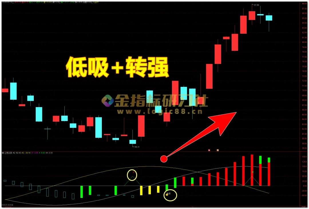:股价还在低位,但下跌速度减慢,动力开始抬头,这是预警信号。 - 白色/图标(买点)