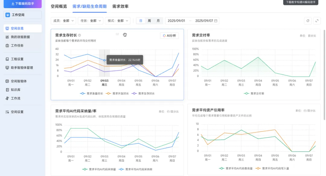 接入DeepSeek V4的源启·数字构建软件工厂,不仅自动汇总全链路数据指标,还在问题恶化前就发出了预警,产品内置研发效能看板,实现从需求到交付的全链路可视化。看板覆盖需求流转、代码产能、交付进度、质量覆盖、资产沉淀五大维度,通过需求流转率、代码采纳率、测试覆盖率、任务完成率、知识复用率等核心指标,让研发效能一目了然。项目管理者可以利用指挥中心,对研发全局了如指掌,让问题发现从被动响应变为主动预防。