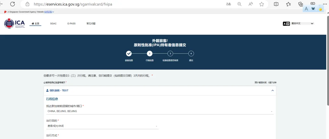 1、通过新加坡电子入境卡在线服务官网进行填写。