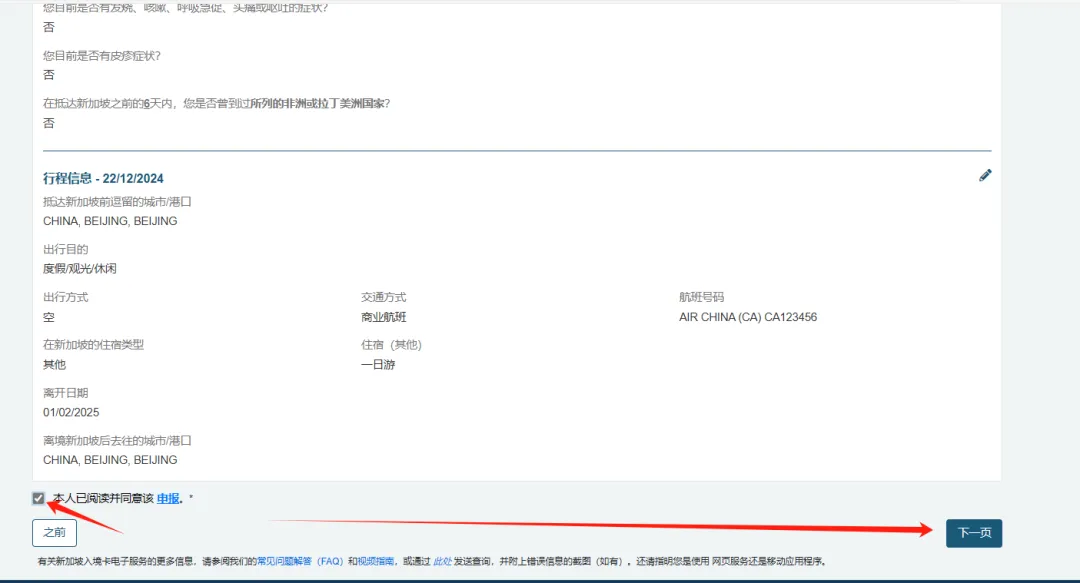 核对所有信息,确认无误后,下拉页面到底端,勾选本人已阅读并同意该申报,并点击下一页。