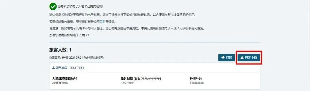 确认信息会直接发送至您填写时提供的邮箱,方便随时查阅。同时,您还可以选择点击页面中的 PDF下载按钮,将新加坡电子入境卡保存为电子版,入境时更加安心!