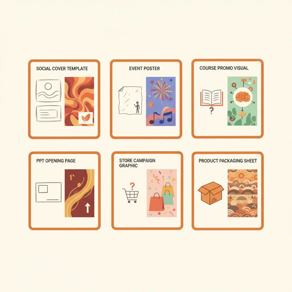 小红书封面; 朋友圈海报; 课程宣传图; 活动促销图; 资料产品封面; PPT 首页设计; 社群招募海报; 门店节日宣传图。