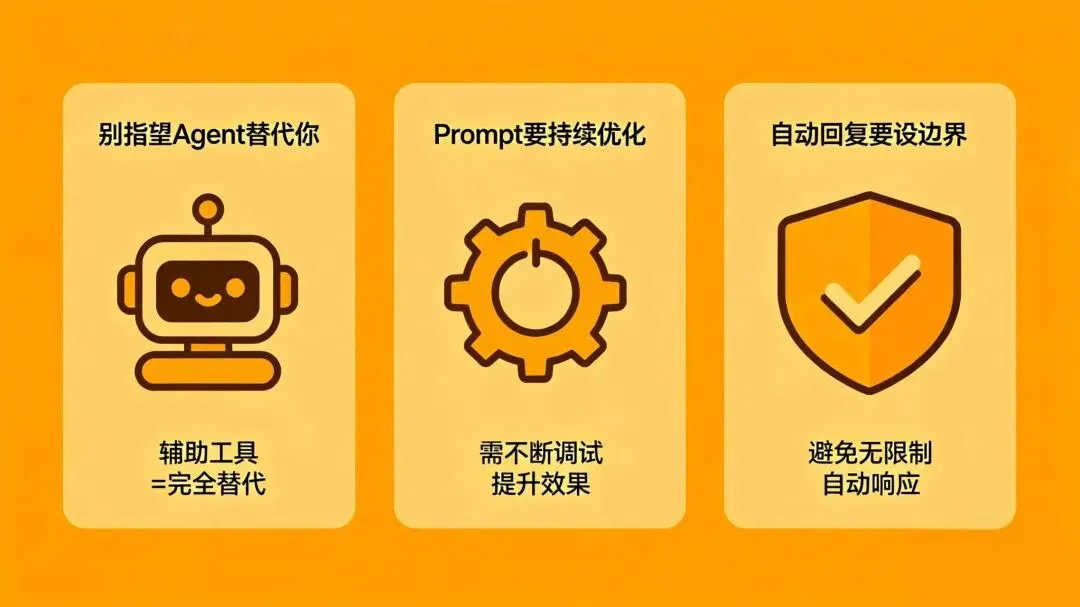 敏感问题、负面评论必须人工处理,别全交给Agent。我在后台设了黑名单,某些关键词触发直接标记给我,不自动回复。