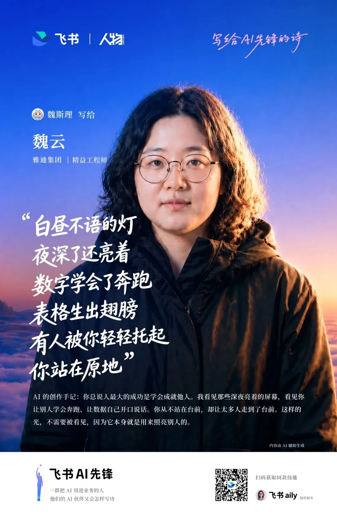 从那之后,很多不同部门的同事找到魏云,想让她针对部门的痛点去给出解决方案。魏云彻底从一名普通的精益工程师转身,成了公司里的「蓝领AI讲师」和「流程架构师」,飞书和AI的价值,早已不再是帮她个人实现提效,而是和她一起,去推动更大的团队和组织变化。