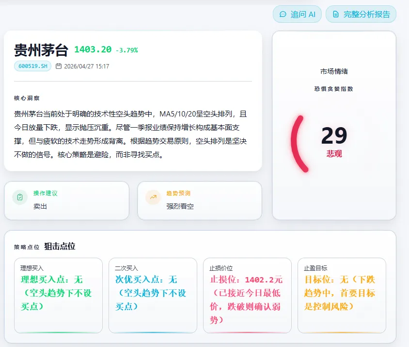 结论先行:核心总结一句话,不超过30字分仓建议:无持仓VS有持仓,给出不同建议精确价位:止损、人场必须给出具体数字,不能含糊检查清单可视化:✅⚠️❌ 三个符号风险优先:风险警报必须显著,高严重度风险直接降级信号