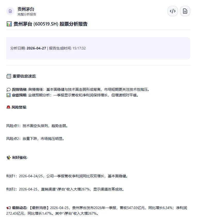 以上,本次实践告一段落,如果有想测试某个A股的分析报告,可以点一下【关注】以及在评论区打出对应的股票代码,我会在后台给出当前时刻的股票分析报告,会有一定的延时。因为涉及到大量token消耗,会适量给出,先到先得。