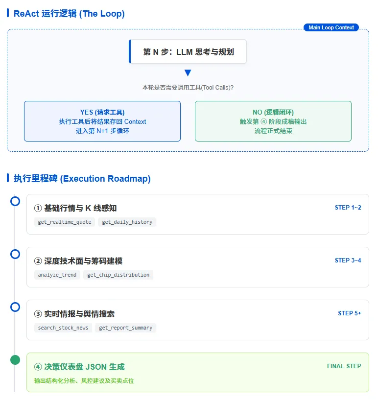 本章节主要介绍下项目主要是用react agent方式,这在llm agent中是很常用的模式,本质上就是llm规划 -> 执行工具 -> 结果返回-> llm进行思考,决定下一步骤的循环模式。最主要的是在这个模式下嵌入了一套标准四阶段workflow。