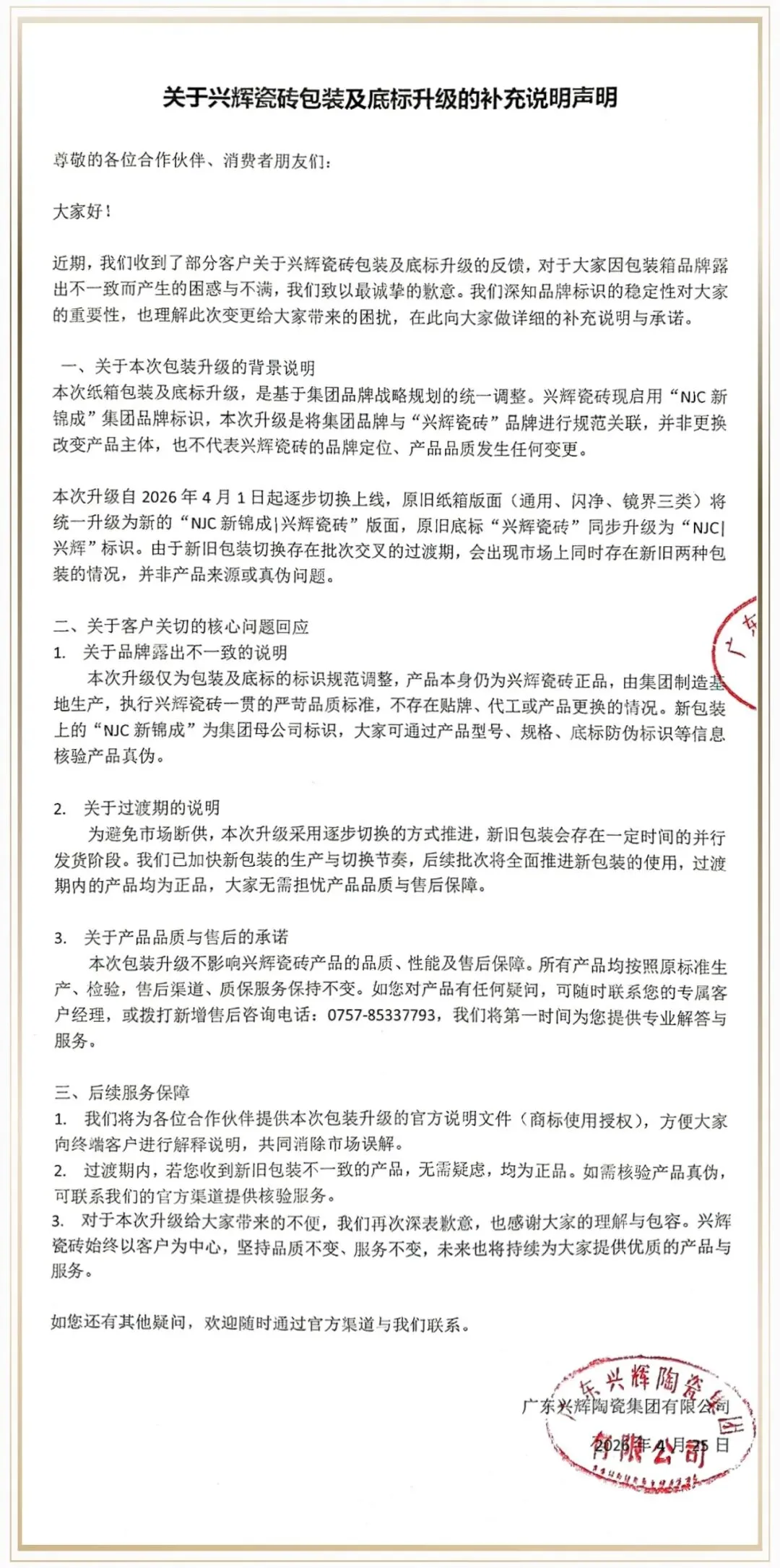 关于兴辉瓷砖包装及底标升级的补充说明声明