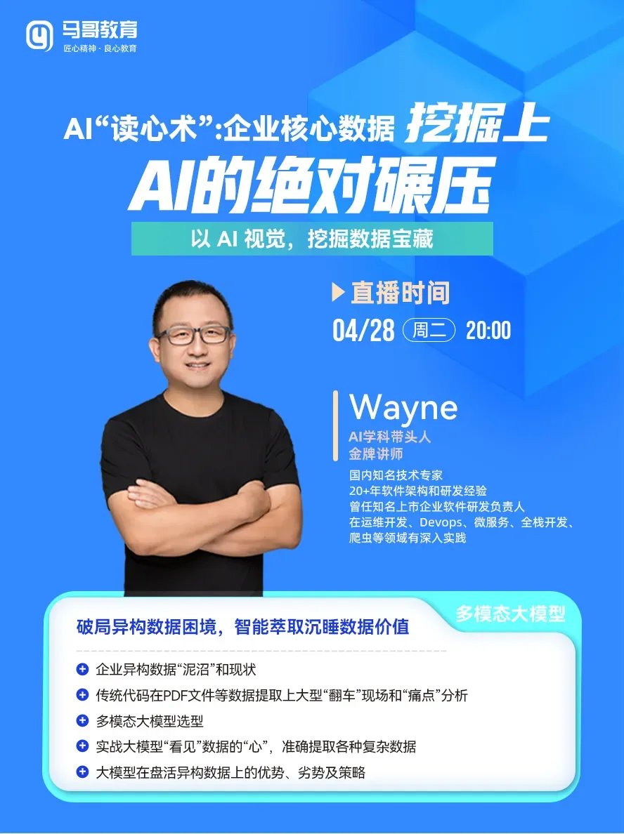 AI读心术:碾压传统!一键盘活企业沉睡数据 还在用老办法死磕企业杂乱数据? 海量 PDF、异构文档、散乱报表越整理越乱? 传统代码提取频频翻车、效率低下、成本居高不下? 现在,多模态大模型带来全新解法✨ 不再生硬解析字符,而是像人一样看懂、读懂数据,一键穿透数据泥沼,轻松挖掘沉睡的核心数据宝藏。 具体怎么落地?来,这场公开课,Wayne老师带你实战拆解。 🔥🔥🔥 【公开课】AI“读心术”:企业核心数据挖掘上AI的绝对碾压 👨🏫 AI金牌讲师 Wayne 亲授 ⏰ 4月28日(周二)20:00 直播间准时开讲! 扫码免费预约听课 课程内容大纲 不讲虚的,全是干货 ✅️ 企业异构数据“泥沼”和现状 ✅️ 传统代码在PDF文件等数据提取上大型“翻车”现场和“痛点”分析 ✅️ 多模态大模型选型 ✅️ 实战大模型“看见”数据的“心”,准确提取各种复杂数据 ✅️ 大模型在盘活异构数据上的优势、劣势及策略 主讲老师 讲师:Wayne老师 马哥教育AI学科带头人、金牌讲师,20+年软件架构和研发经验,曾任知名上市企业软件研发负责人。 预约听课 4月28日晚20点,别用老办法死磕了。 感兴趣的同学,来直播间,让AI帮你挖出那些沉睡的数据宝藏。 扫码预约,免费听课 前10名添加老师,可免费领取PDF资料《专家agent提示词合集》一份 马哥教育 新课上新 马哥教育2026全新课程《AI全栈实战营》已上线! 拒绝空谈理论,只做企业级交付。 从Coder到AI系统编排者,让你一次学习吃透工业级AI全流程。 目前已经有多位学员报名,想要学习的同学,赶快抢占学习名额吧! 🔥新课首发,团购有优惠 扫码获取:课程大纲 + 优惠详情