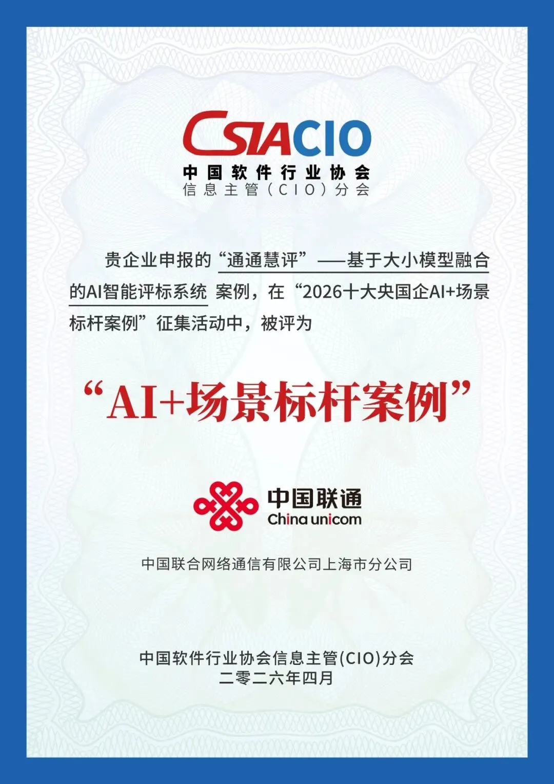 上海联通荣获2026十大央国企AI+场景标杆案例