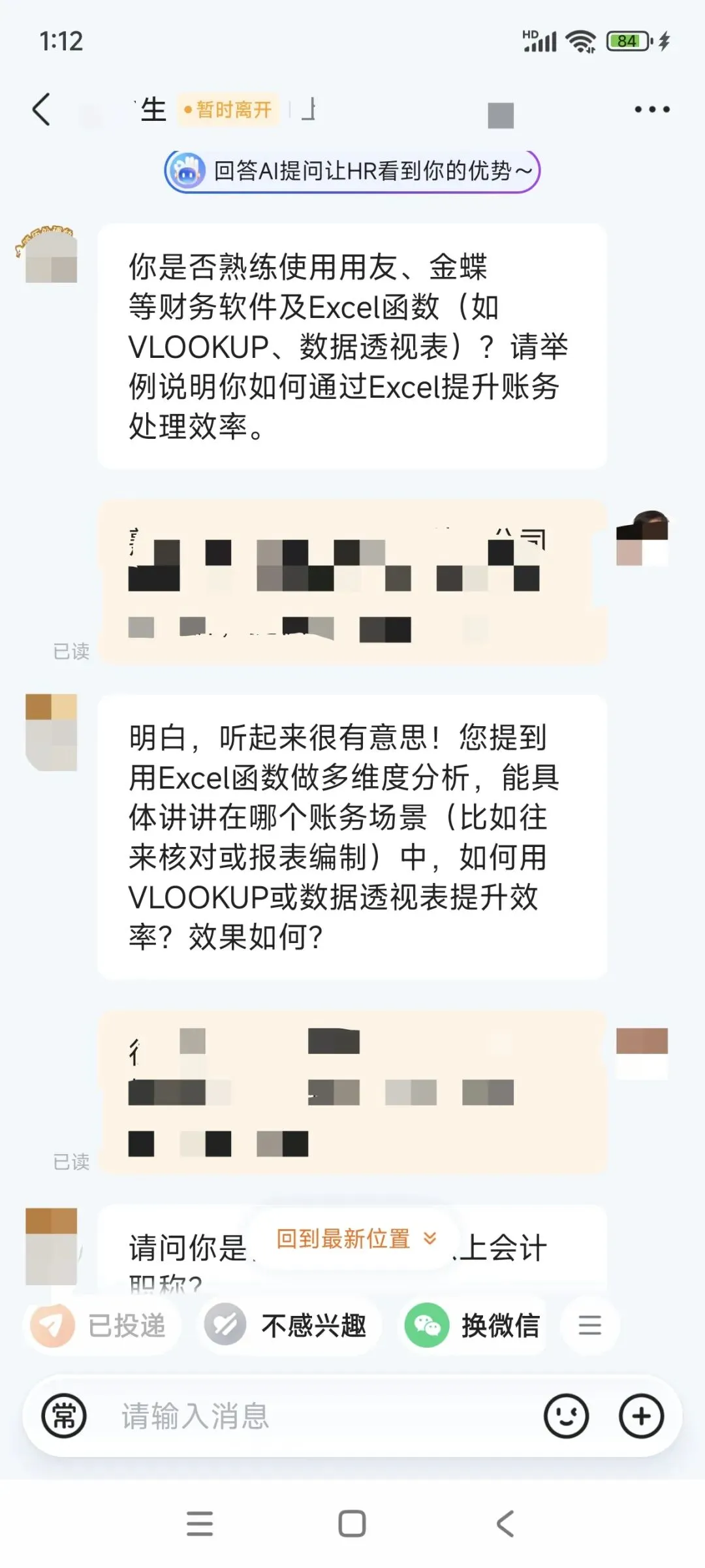 沟通完不久就看到标记为“不合适”,说实话猛的一下子看到有点不适应,就仔细看了一下沟通记录,最上面有一句话:“回答AI问题让HR看到你的优势”;哦,原来是这样!