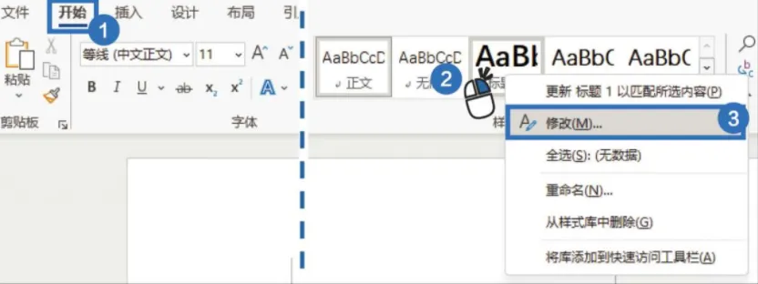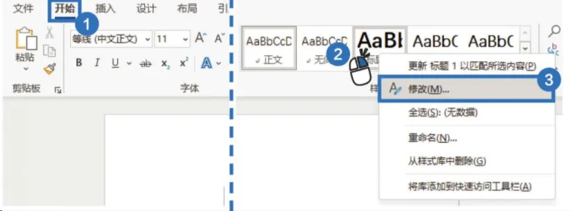 1、在【开始】选项卡的功能区中,用鼠标右键单击【标题1】样式,在弹出的菜单中选择【修改】命令。