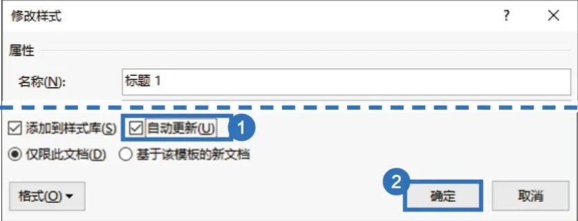 2、在弹出的【修改样式】对话框中,勾选【自动更新】复选框,单击【确定】按钮。
