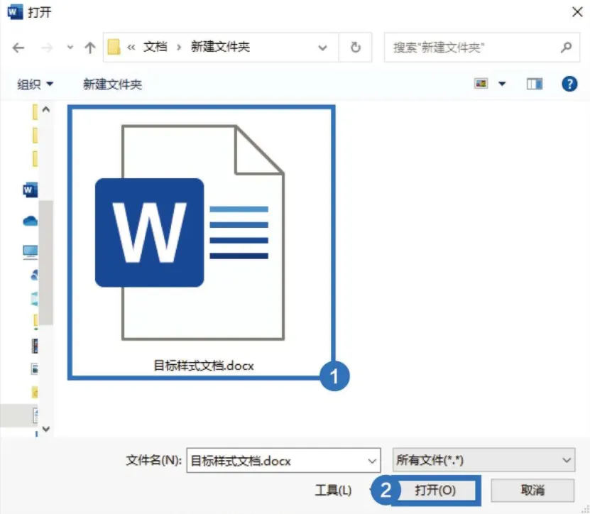 4、在弹出的【打开】对话框中选择需要导入的目标样式文档,单击【打开】按钮。