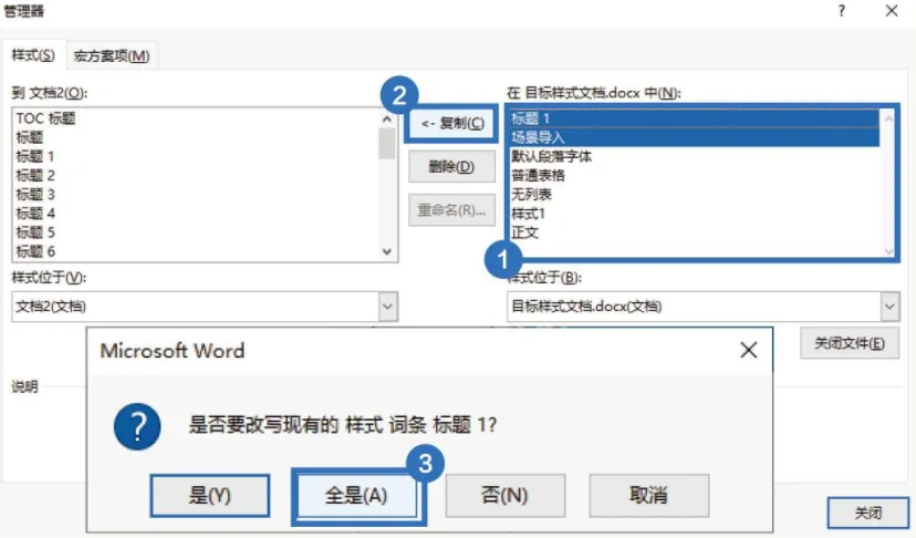 5、在【管理器】对话框右侧样式窗口中按住【Ctrl】键选中需要导入的样式,单击【复制】按钮,在弹出的对话框中单击【全是】按钮。
