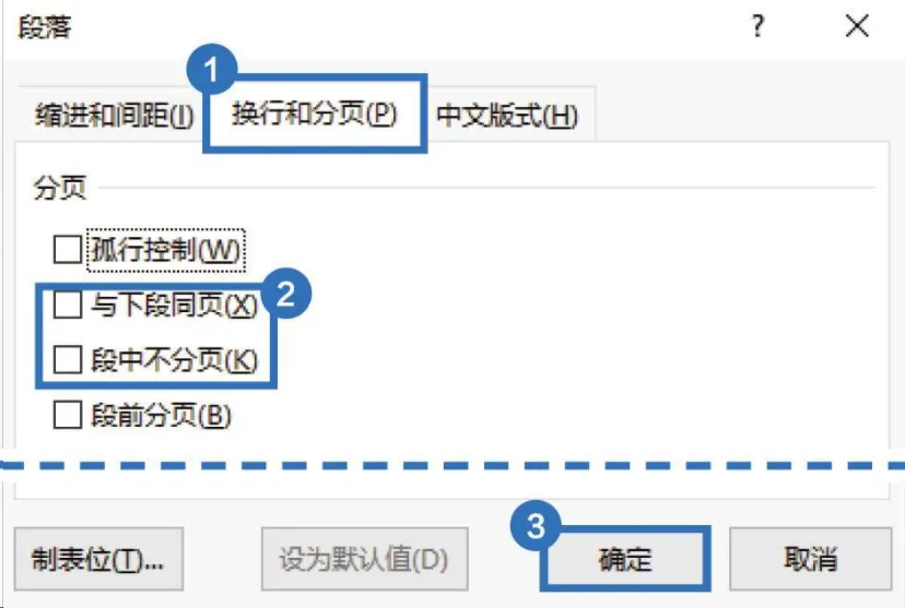 3、在弹出的【段落】对话框中切换到【换行和分页】选项卡,取消勾选【与下段同页】和【段中不分页】复选框,单击【确定】按钮。
