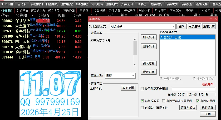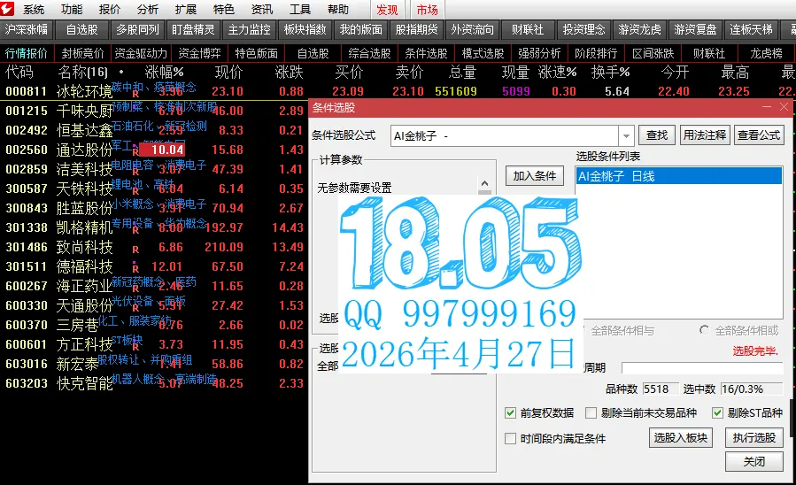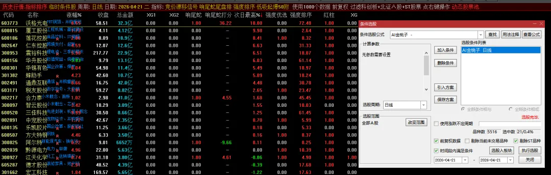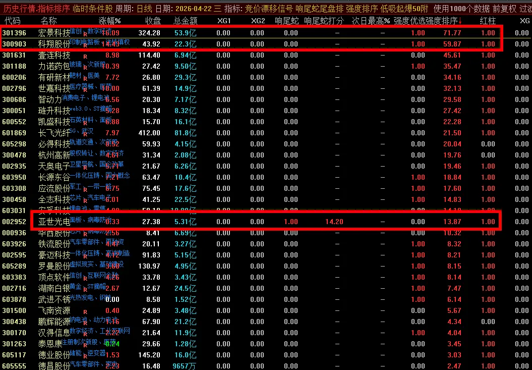 上面是金桃子软件昨天选出来的,看来没涨停的可以做尾盘,这个策略不错。 结合响尾蛇,强度排序指标,居然第一名今天涨停了。以后多加注意金桃子的尾盘。
