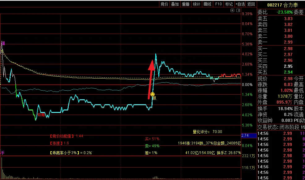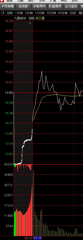 当日-6个点预警,看分时图,不应该买了,而且前面有3个涨停板,已是高位,一直在均线下方。调到第3日,回到第一个涨停板的起涨位置可以搏一个反弹,次日涨停了。