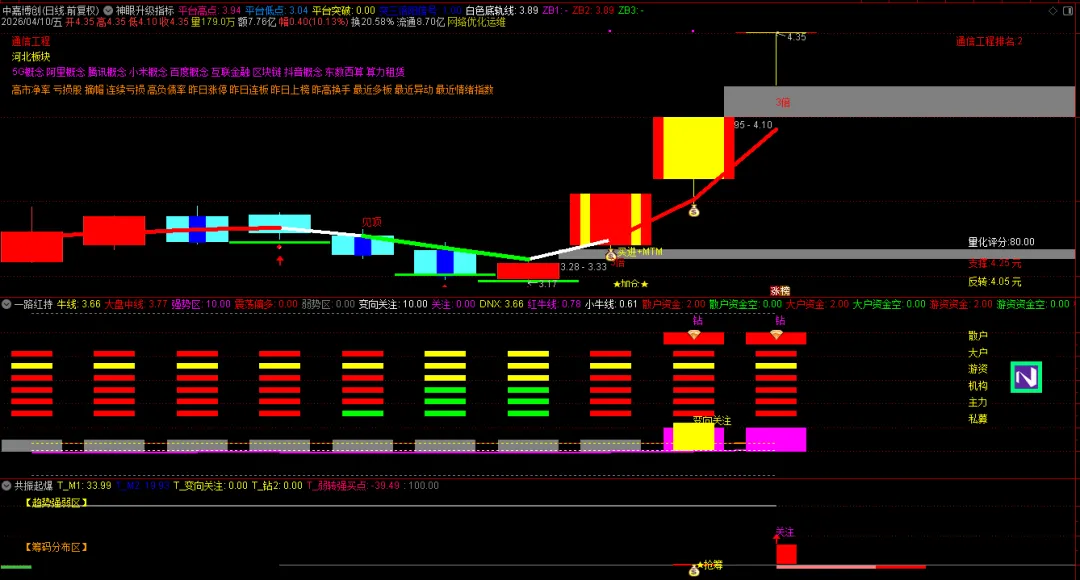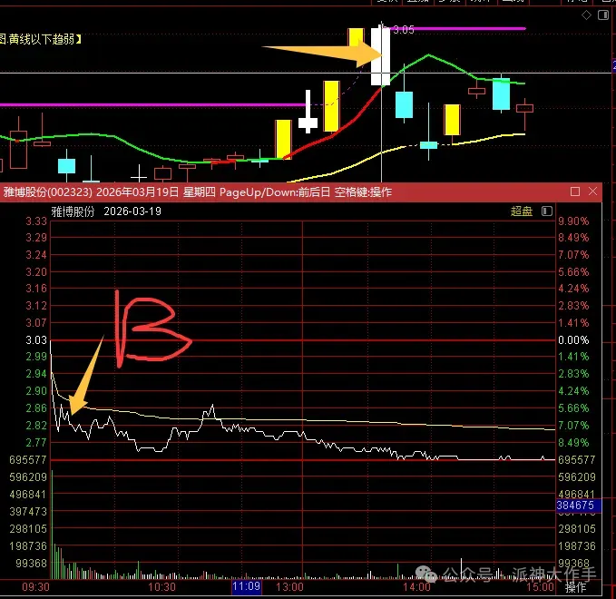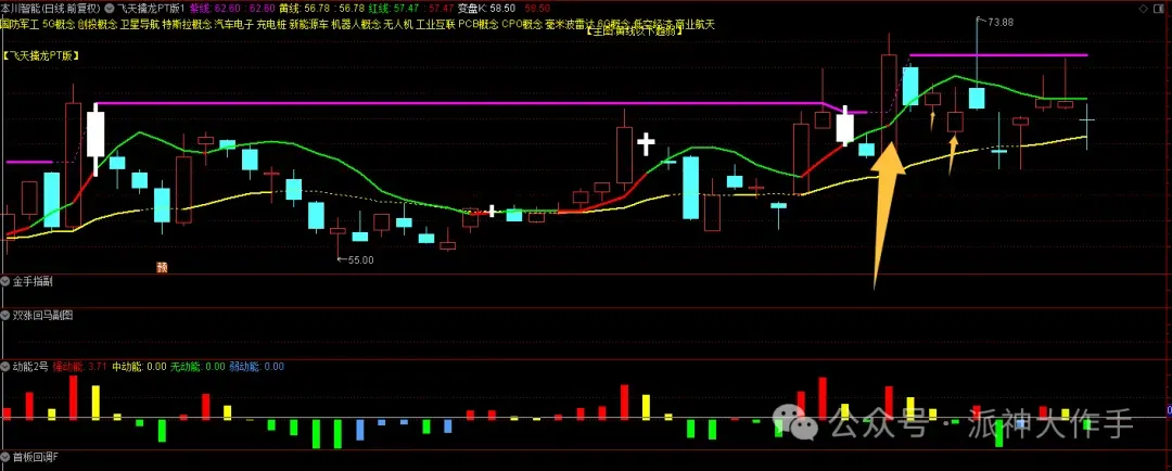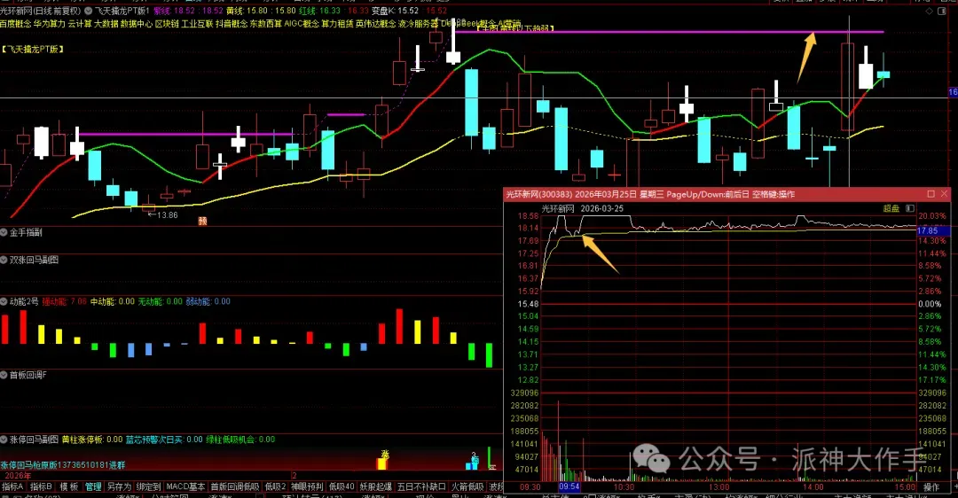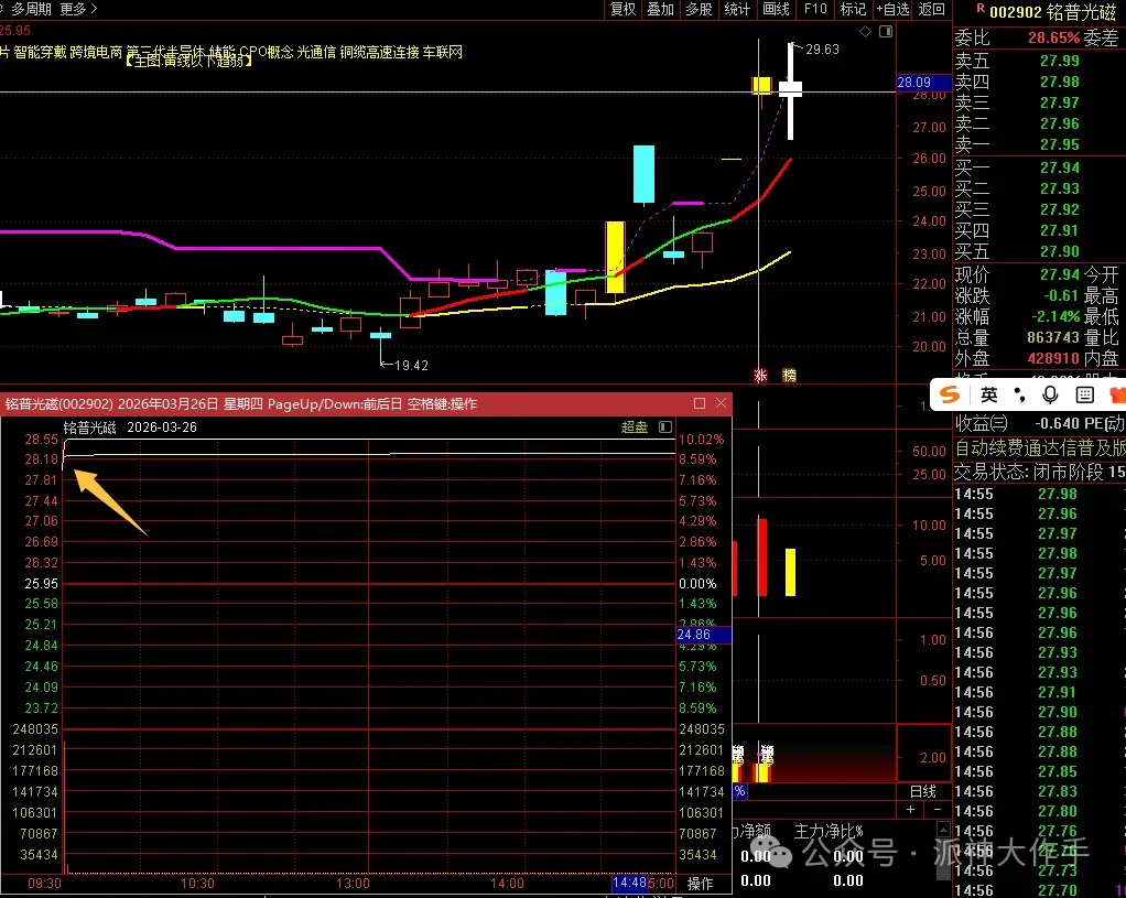 铭普光磁实际上是买不到的,秒板,反应不过来。但是前面有一个放量大阴线,首板之后而且是底部箱体突破回踩的,第三日的小阳线是绝佳的买点。