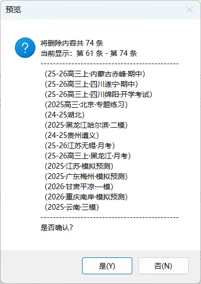 设置方法:打开 Word → 文件 → 选项 → 自定义功能区 → 勾选“开发工具”;按 Alt+F11 打开 VBA 编辑器 → 在左侧选中 Normal → 插入 → 模块 → 粘贴代码 ;然后添加到自定义功能区:文件 → 选项 → 自定义功能区 → 右侧新建选项卡或新建组 → 左侧下拉选择“宏” → 选中你的宏点击“添加” → 点击“重命名”修改名称和图标 → 确定。再从文件 → 选项 → 信任中心 → 信任中心设置 → 宏设置 → 选择“启用所有宏”。即可在功能区直接点击使用。正确设置后运行,需要删除的题目来源信息会显示在通知窗口。信息过多时会分页显示,逐一确认后将执行删除。