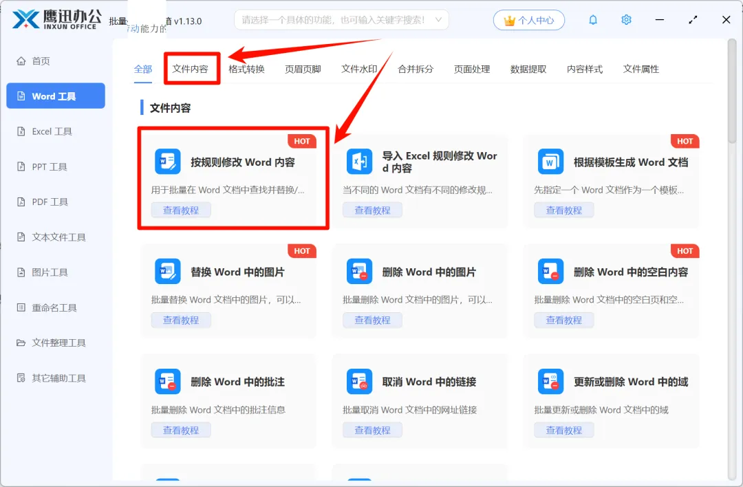 1、打开「鹰迅批量处理工具箱」,在「Word工具」中选择「按规则修改 Word 内容」功能。
