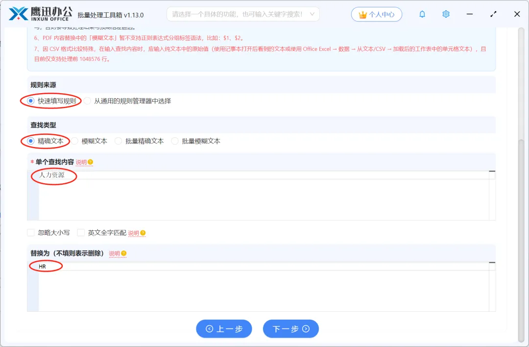 这里由于我们需要查找的内容是精确的,我们勾选【精确文本】,如果我们需要删除手机号,身份证号这种我们就需要勾选【模糊文本】了,然后分别输入查找和替换后的内容。