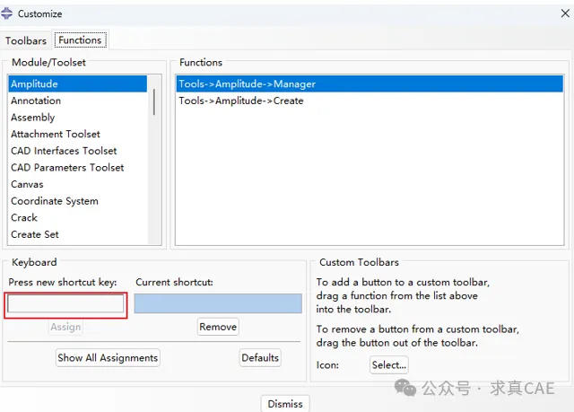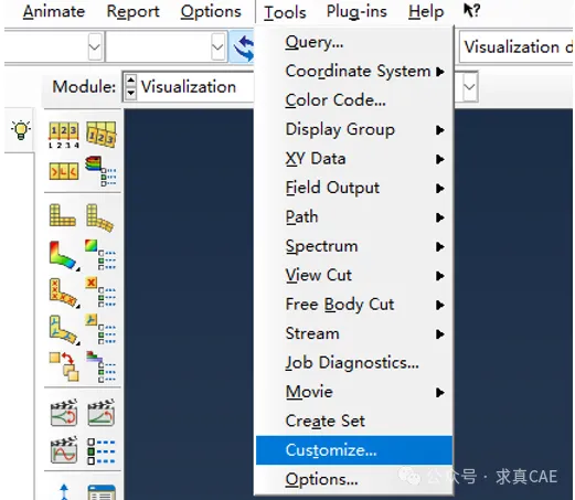 ABAQUS有提供键盘操作命令,如下菜单栏中,各命令均可通过Alt键+命令下划线字母的组合键来进行快速选择(如想打开Tools菜单,可通过“Alt”+“t”的组合键快速打开),另外也可在Customize…命令中自定义,只需找到自己需要的命令后键入快捷键即可。