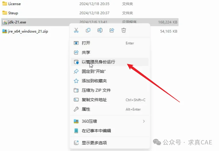 3、回到安装包文件夹,鼠标右键单击jdk-21.exe,以管理员身份运行(此插件为安装帮助文档必备)